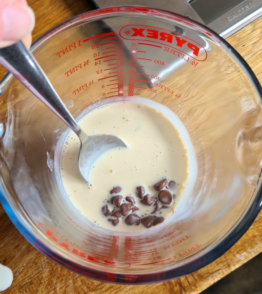 To make the glaze, heat the cream until steaming. Add in the Baileys and the chocolate chips. Pour the cream and Baileys mix over the chocolate chips and mix thoroughly until smooth and glossy.