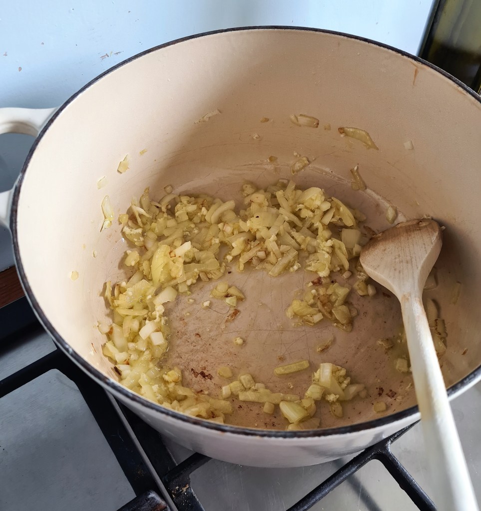 Over a low to medium heat, add the olive oil to a large oven proof lidded saucepan. Once heated, add in the chopped onions and stir. Allow to soften for about 1 minute. They don’t need to fully cook. Add in the crushed garlic and stir.