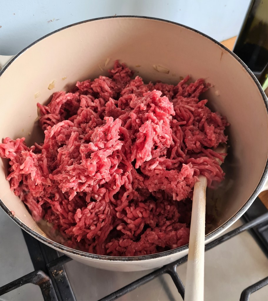 Turn the heat up a little and add in the beef mince. Stir every few minutes until all the mince has browned.