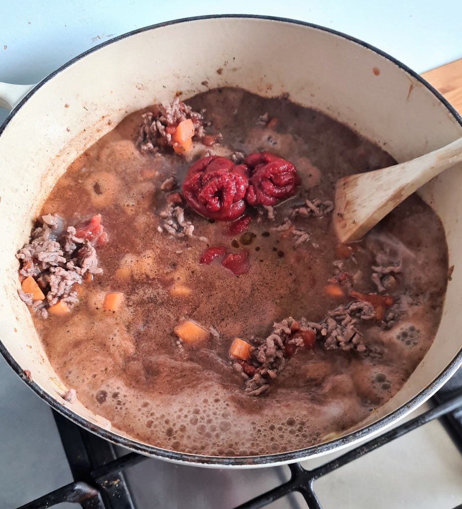 To the pot, add in the red wine, dried herbs, tin of tomatoes and the chopped carrot and stir. Cook until it is hot again. Add in the hot beef stock and the tomato purée and stir. Bring to the boil and then turn off the heat.