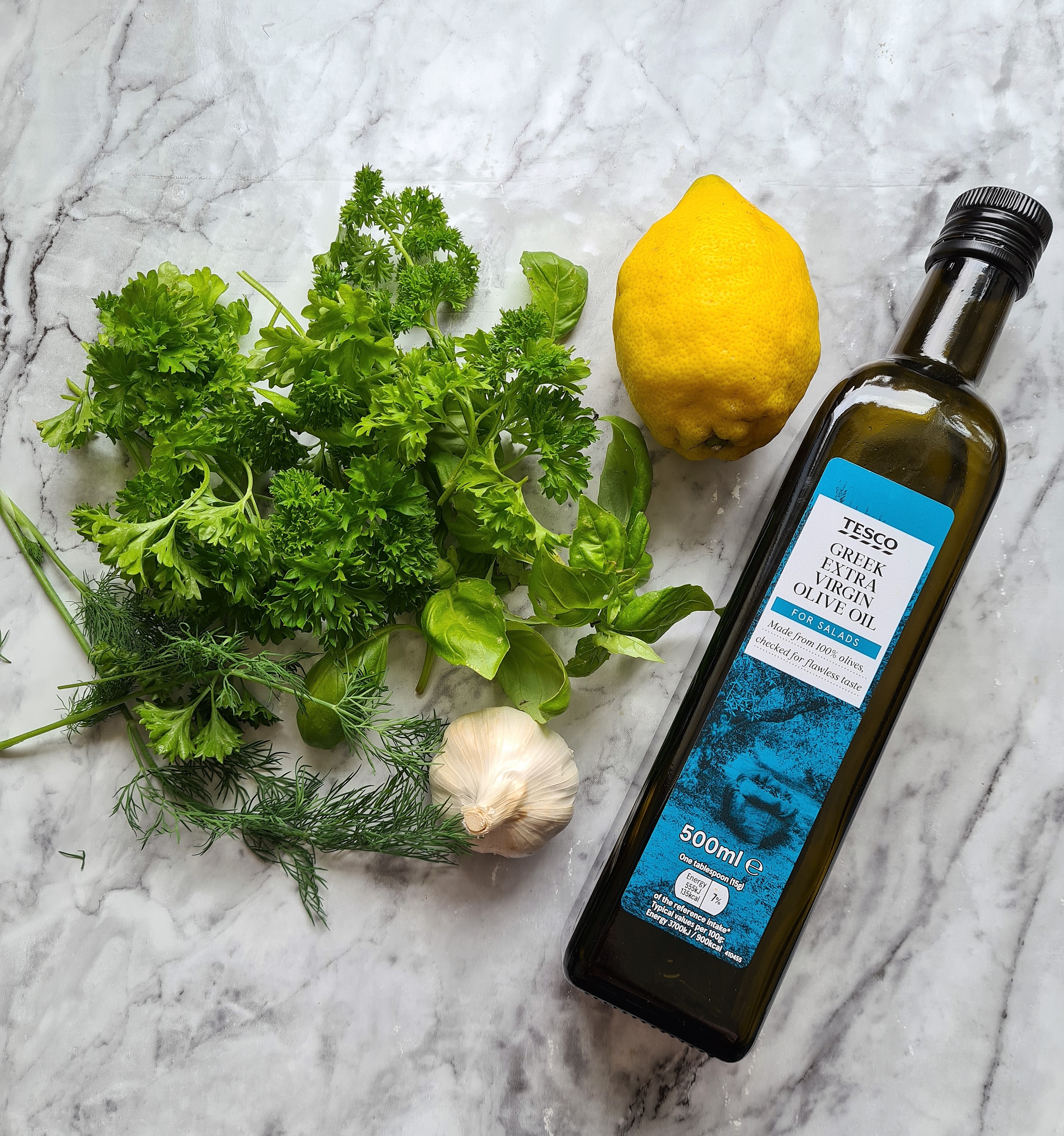 You can chop the herbs finely, crush the garlic, zest and then juice the lemon and pop in a bowl with the olive oil, season with salt and pepper and mix or you can simply pop everything into a mini blender and give it a gentle blitz until the herbs are just chopped.