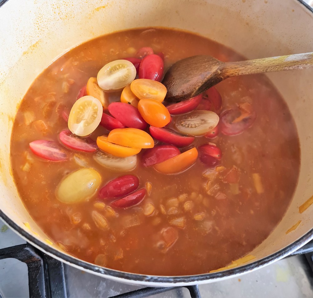 Add in the chopped tomatoes and cook for 5 minutes. When the soup is cooked, take off the heat and add in your spinach. I don’t chop my spinach but feel free to. The spinach will wilt in the heat of the soup.