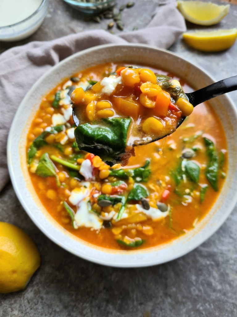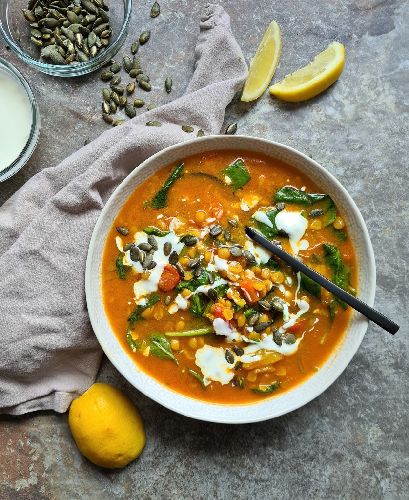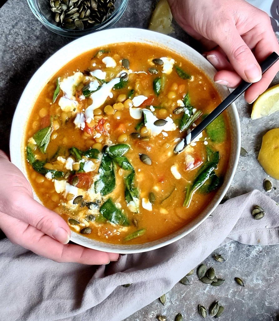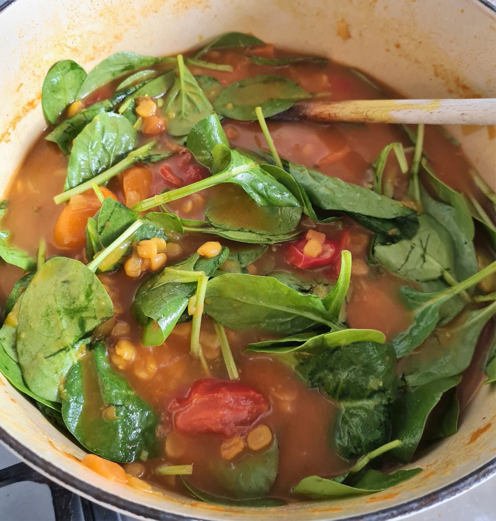 Using a mix of dried spices and split peas paired with some lovely fresh spinach and tomatoes, this soup is a great bowl of smell and flavour and so nutritious and wholesome.