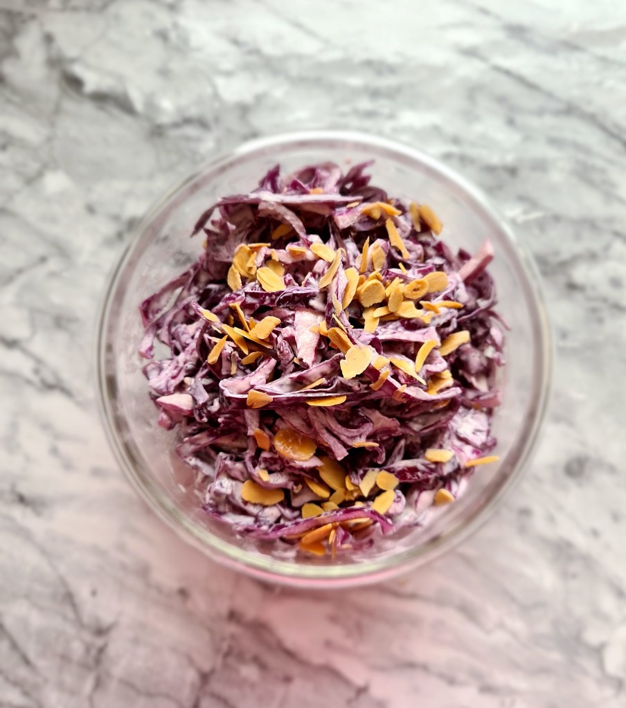 I love this red cabbage slaw combined with a few pre-roasted vegetables (done on a meal prep Sunday) and a rotisserie chicken that can be picked up on the way home from collecting my son after work. Of course you can combine it with whatever you want but I love that I don’t have to cook anything at all on the day for this meal.