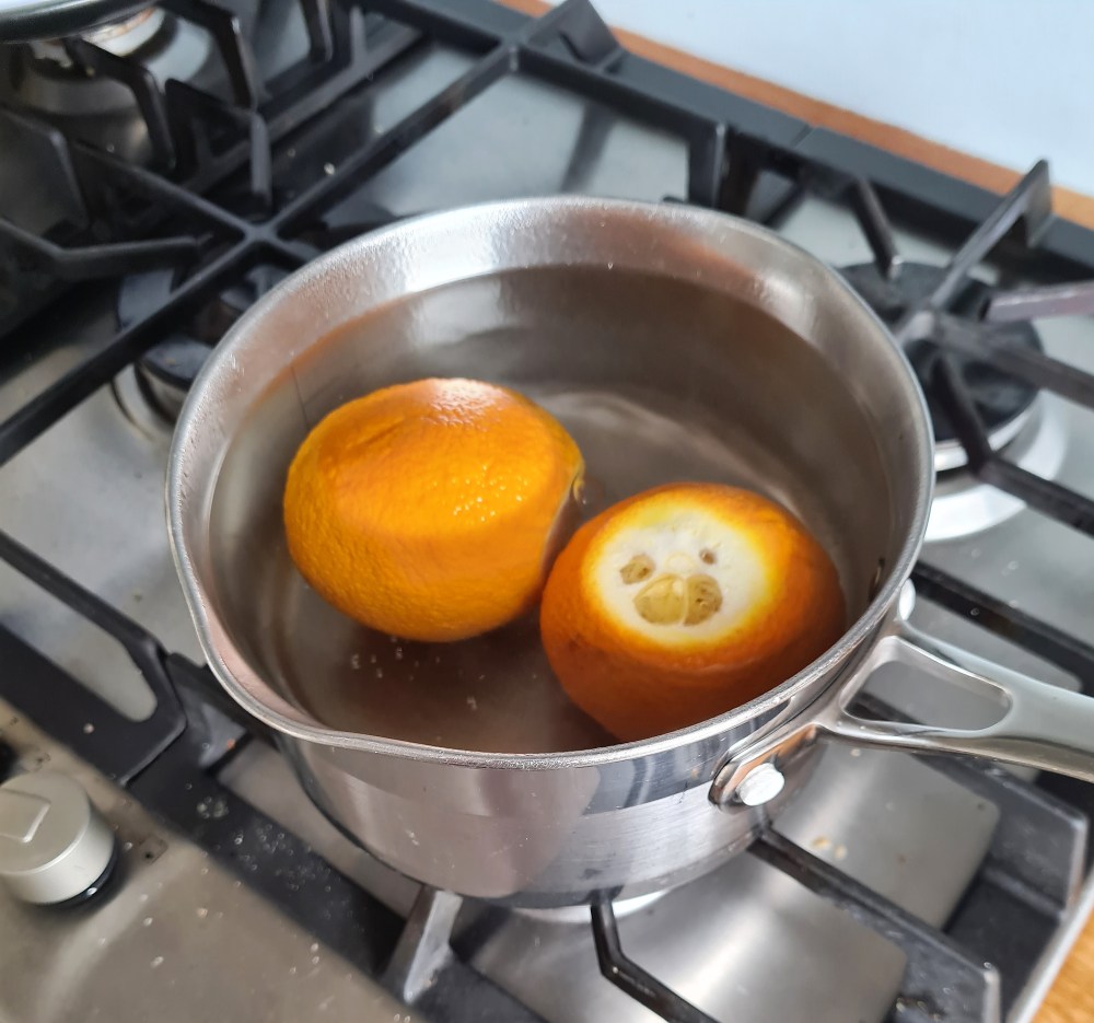 To start, cut the ends off your oranges. Bring a pot of water to the boil and add your oranges to it. Simmer for 15 minutes and then remove the orange from the pan and leave to cool. I don’t throw the orange water away, in case I need to loosen the cake mix later on.