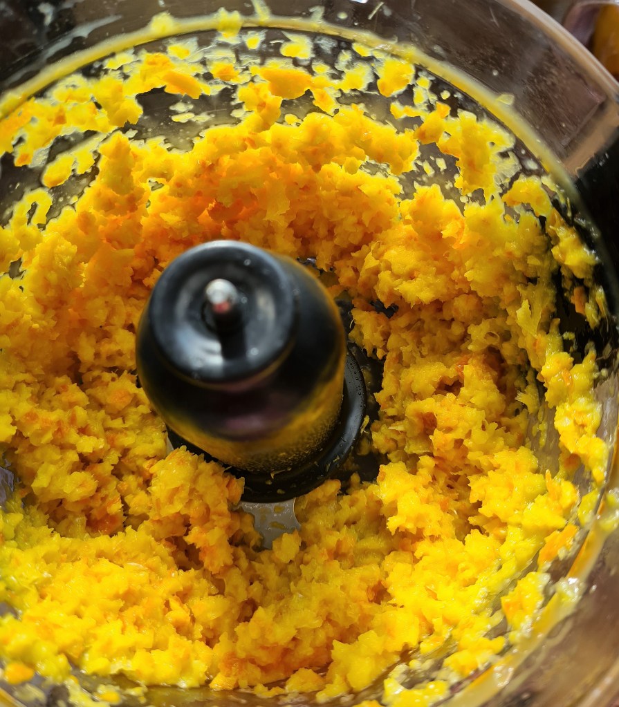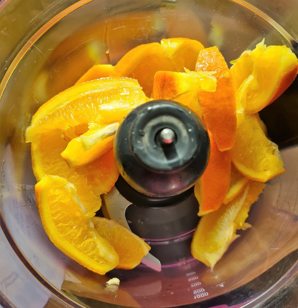 Pop the oranges into a food processor and blitz until finely chopped.