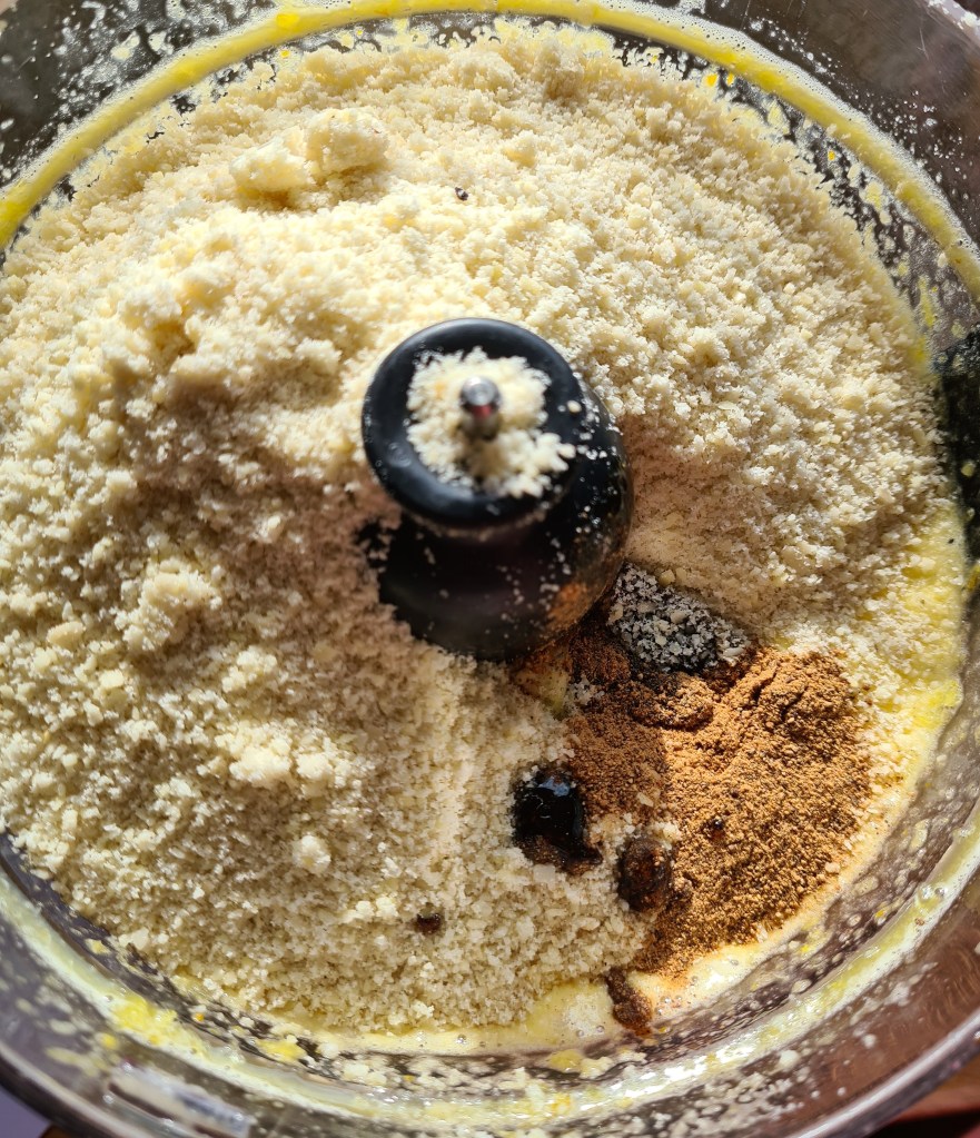Add the two sugars and the eggs to the processor and blitz just to mix. Add in the ground almonds, nutmeg, vanilla, almond extract and the baking powder and blitz again.
