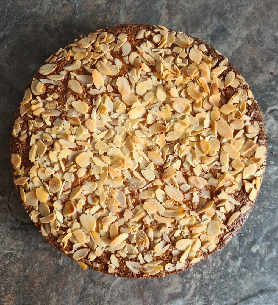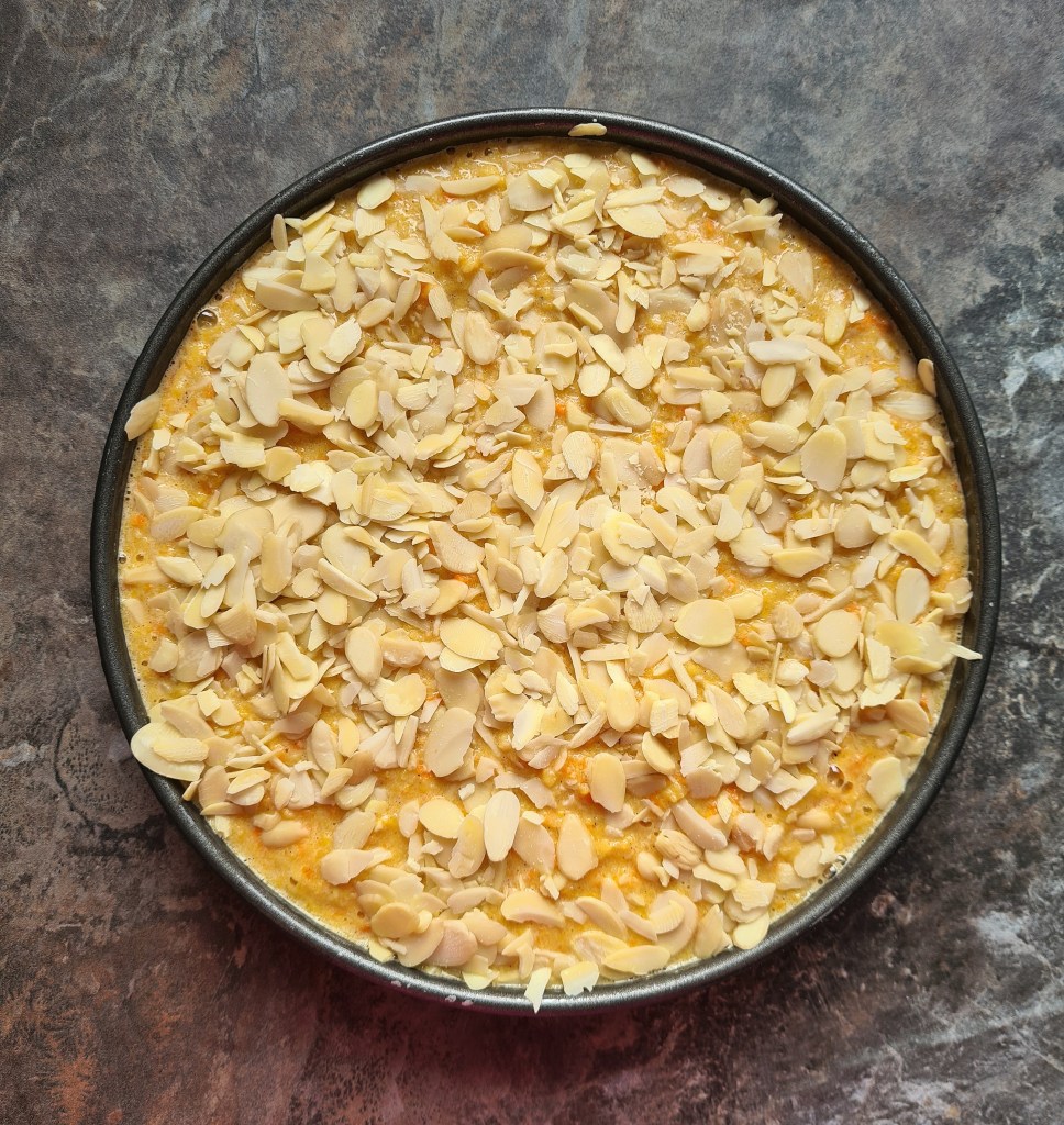 Pour into your lined tin, sprinkle with the flaked almonds and pop into the oven for 1 hour. If during the cook, your almonds look to be browning too much, you can gently cover the top with foil.