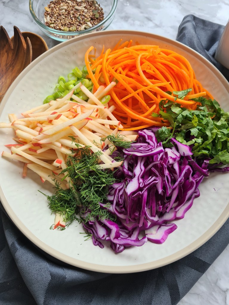 Julienne the carrots and apple. I use a julienne peeler for the apple and carrot, but if you don’t have one, you can grate them instead. Add the apple and carrot to the mixing bowl