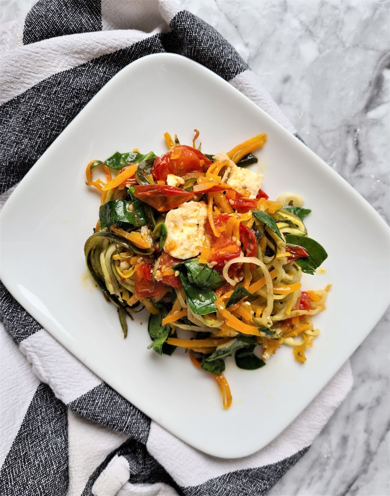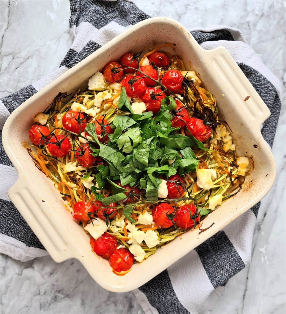BAKED COURGETTE AND BUTTERNUT SQUASH NOODLES WITH FETA AND CHERRY TOMATOES
