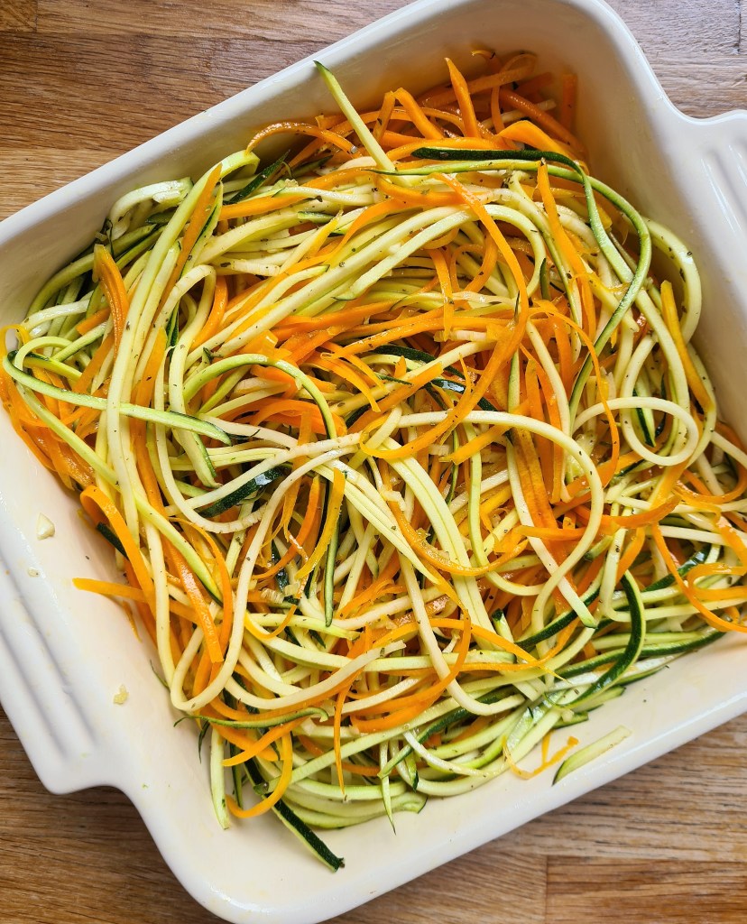 Spiralize or julienne the courgette, butternut squash and carrot straight into an oven proof dish.