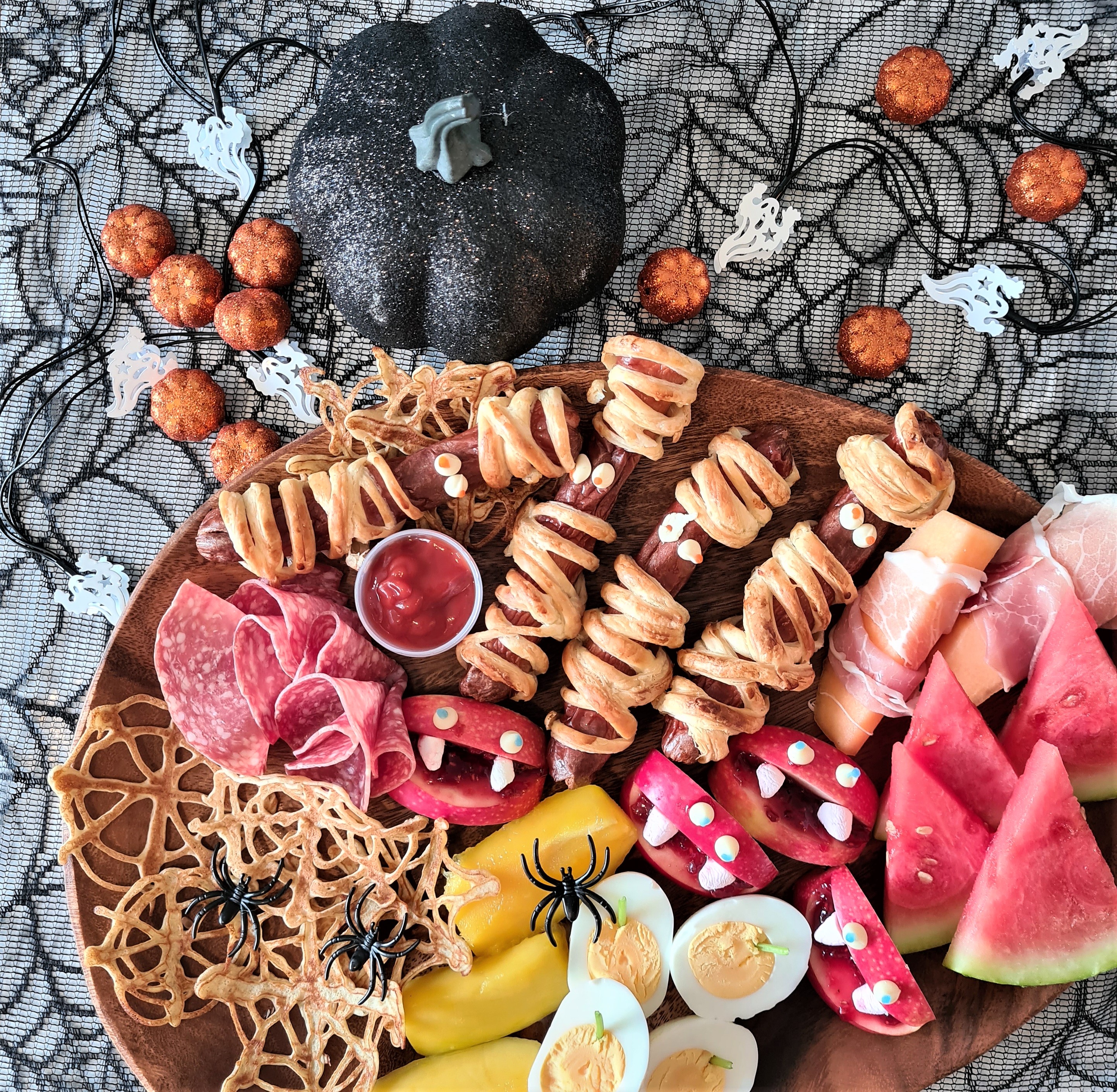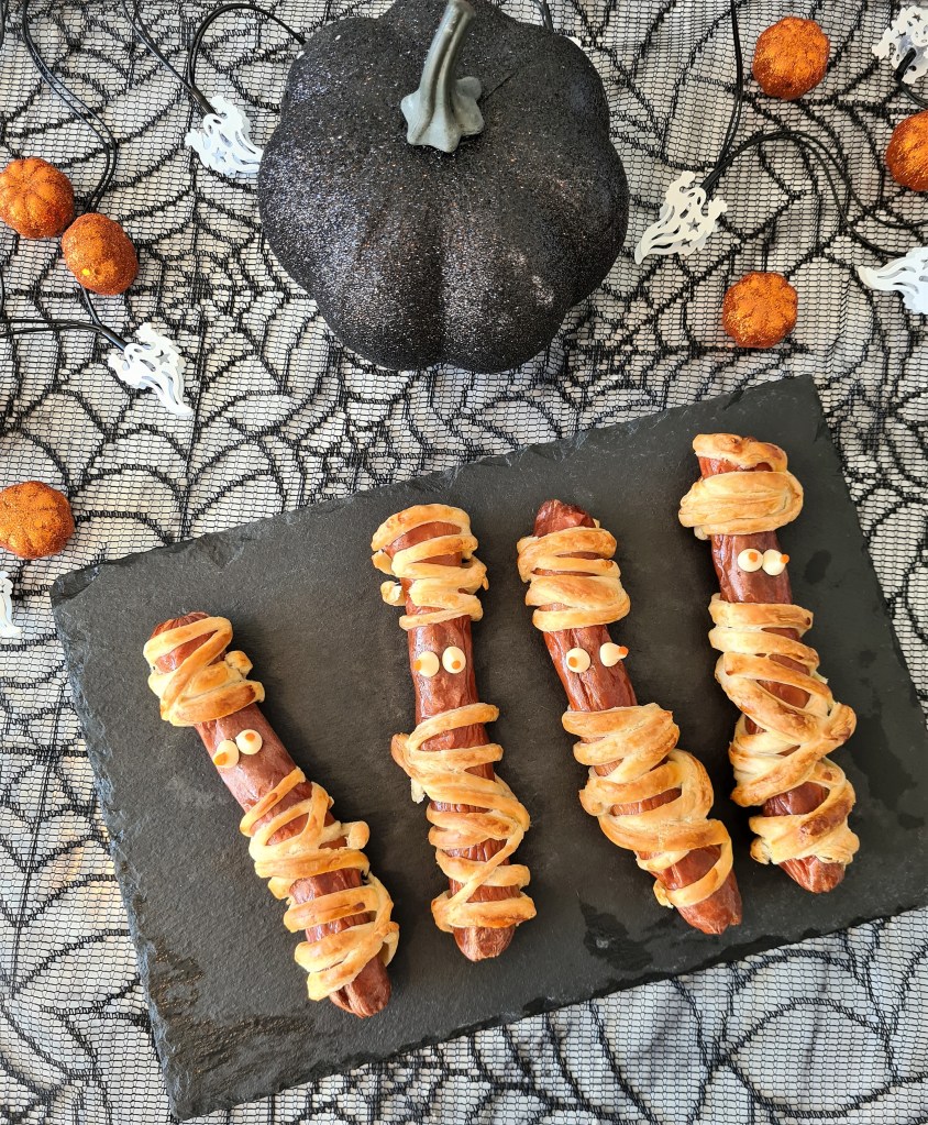 Spooktacular mummy dogs are a play on a sausage roll and a great Halloween party food. There can be too much emphasis on sweets at Halloween so we always have a proper meal before or after trick or treating, before any sugar gets consumed. It’s just a rule in this house at Halloween.