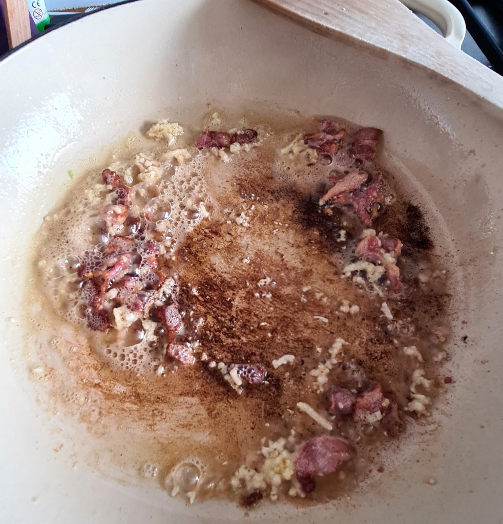 In the same pan, add the second tbsp of oil and the butter and add in your bacon. Cook until golden brown and sizzling.