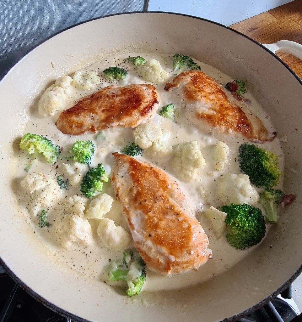 This creamy chicken dish is perfect for all the family. Tender chicken breasts cooked in a rich creamy sauce with broccoli and cauliflower all made in one pan. It’s rich and decadent and super comforting.