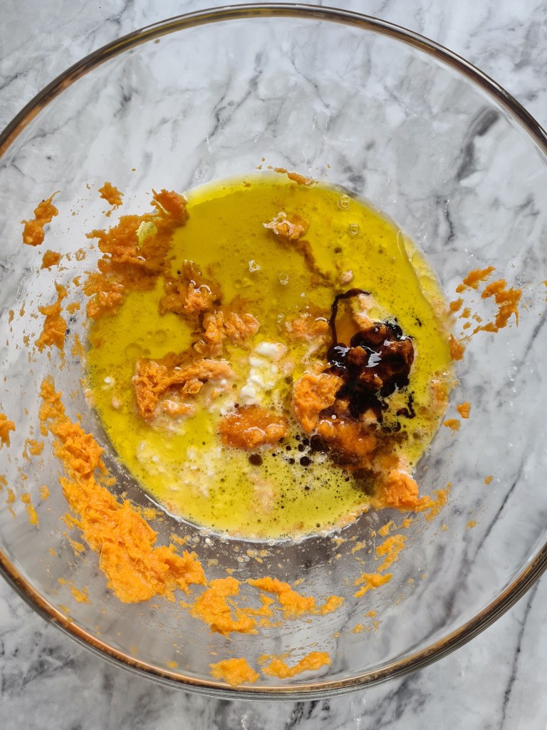 Whisk the olive oil, milk, maple syrup and vanilla into the pumpkin/sweet potato. This doesn’t take a lot of time, literally just about 20 seconds.