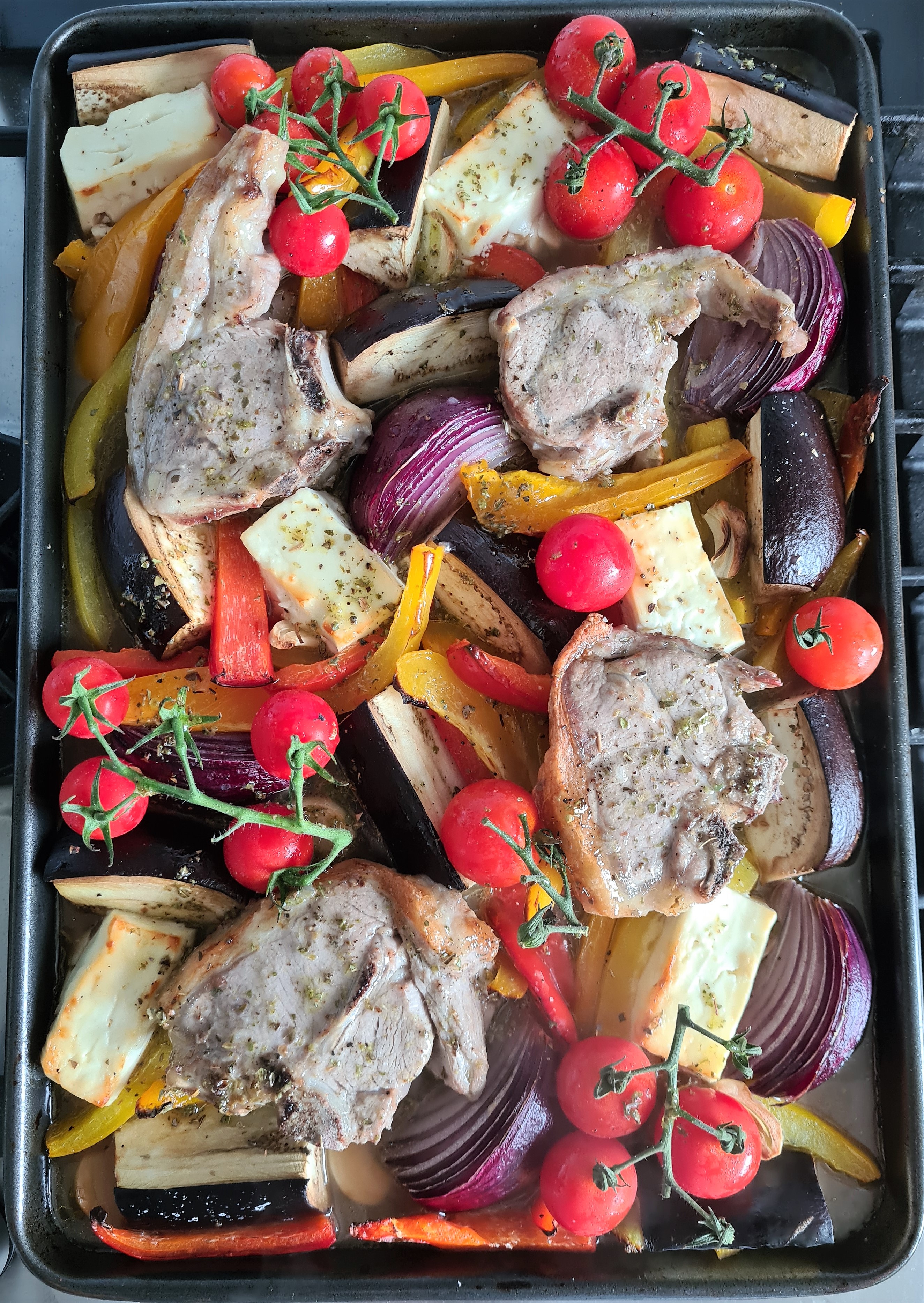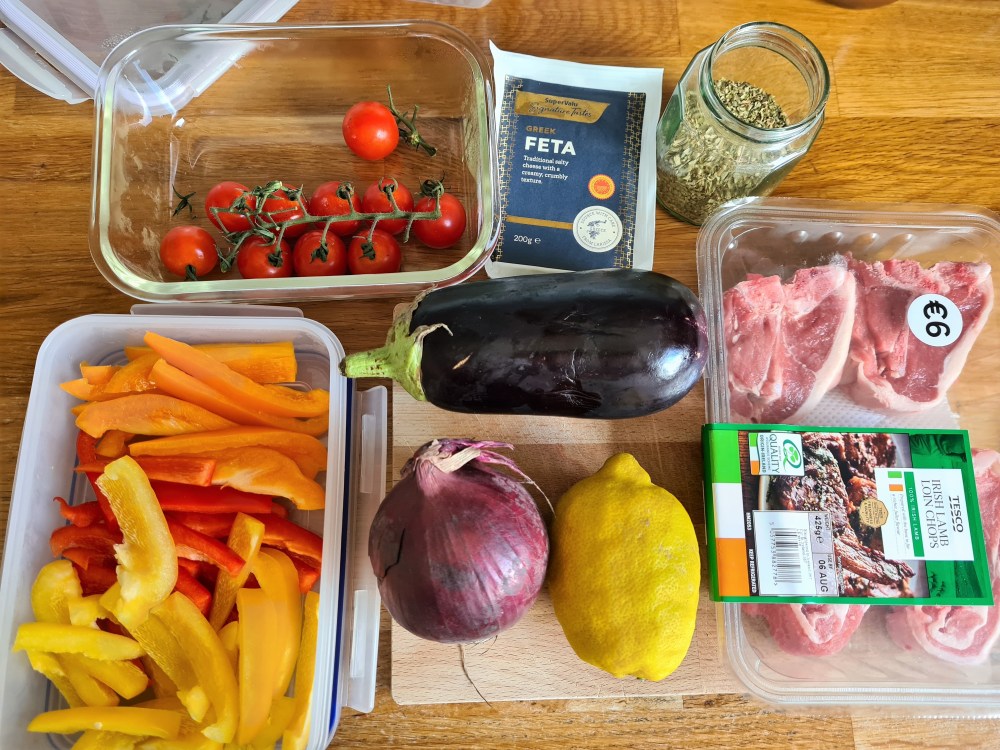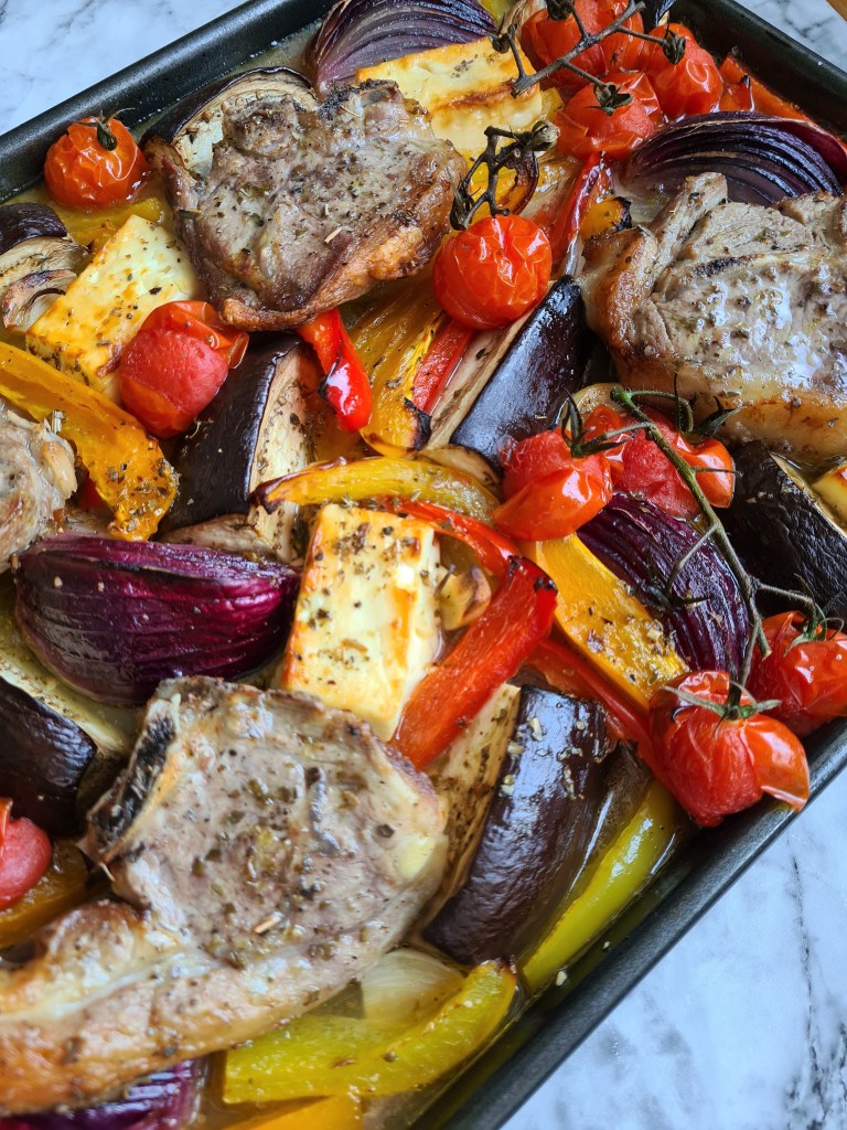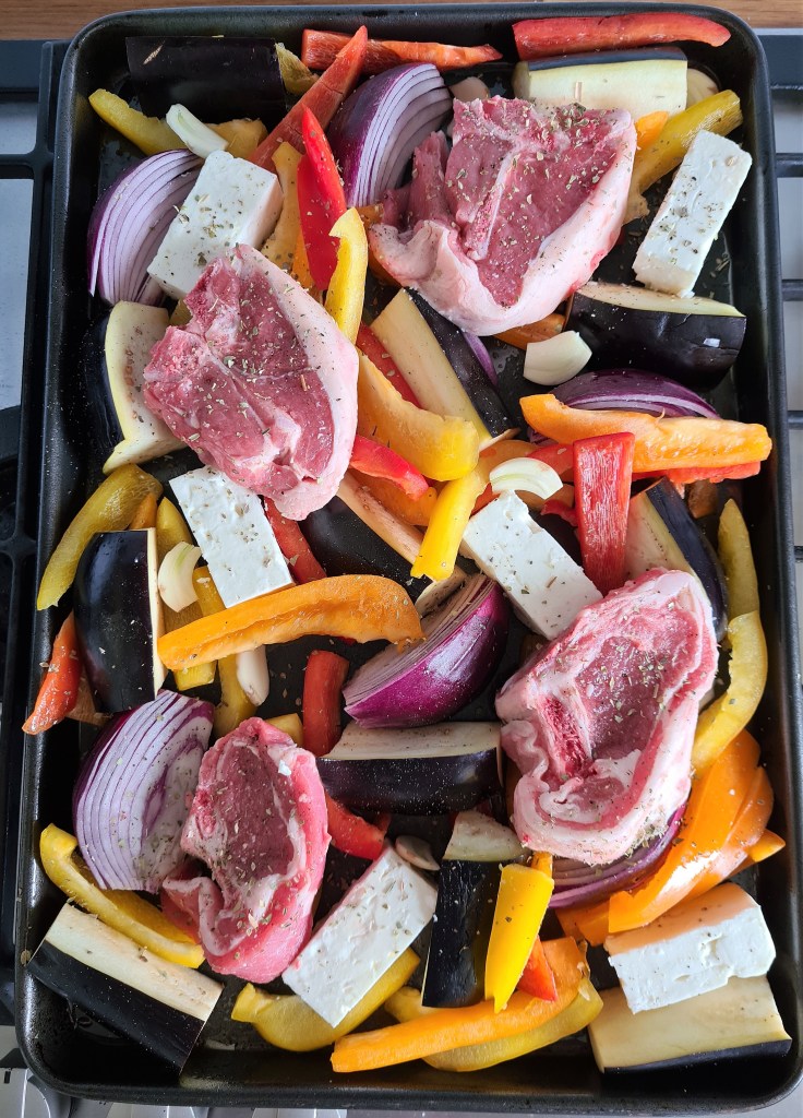 This traybake is so simple and so good. Lamb chops oven roasted with mixed peppers, onion, aubergine (or potatoes) and feta with a lemon and oregano sauce. All done on one oven tray and cooked in just 25 minutes. The preparation is really simple and there is no hassle involved. It is great for Sunday roast or any day of the week busy or not and also suits any weather.