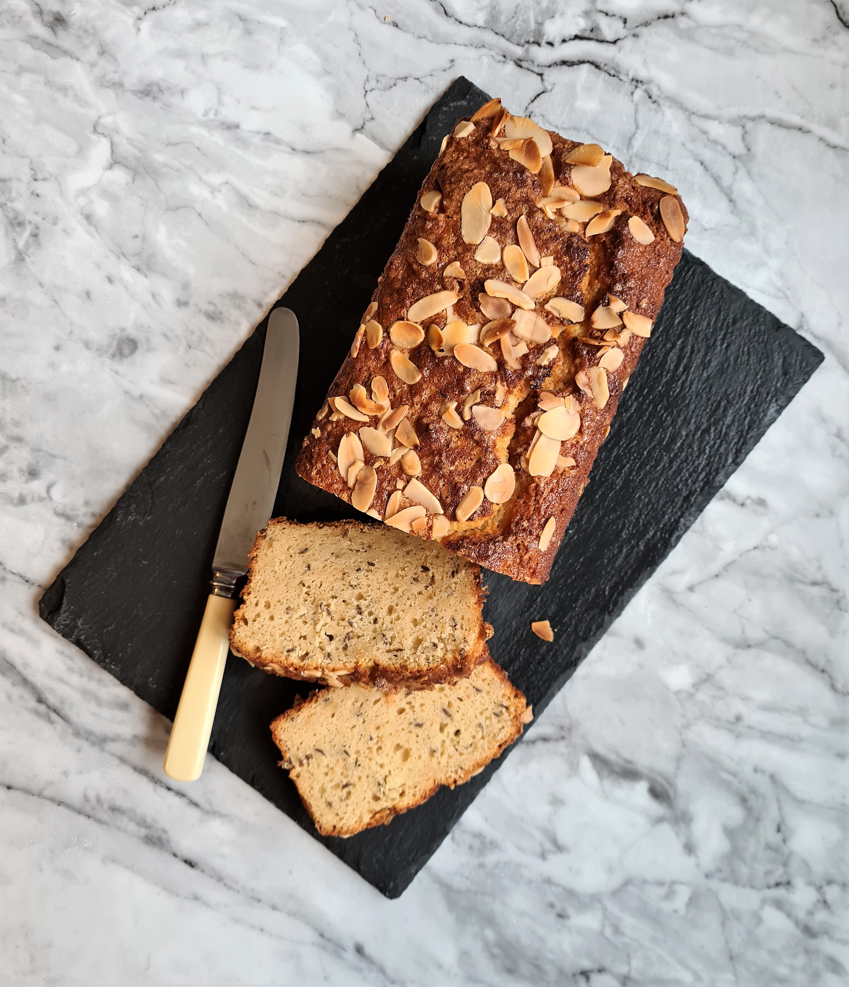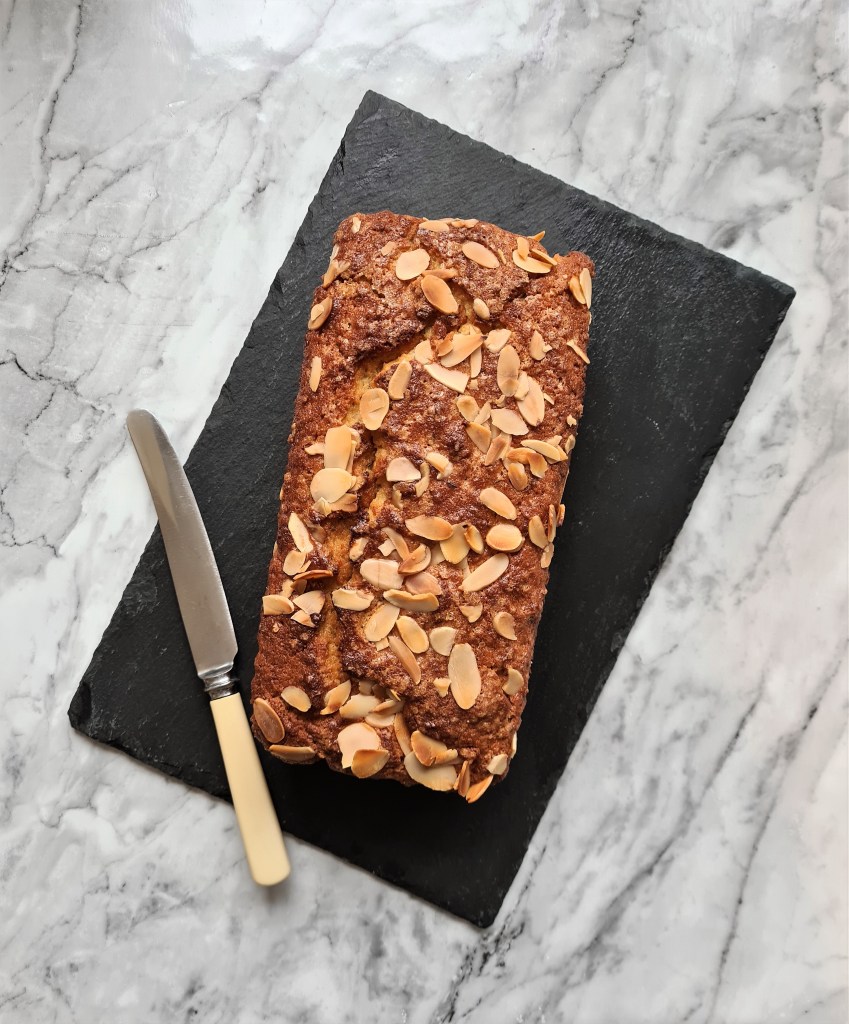 Spoon into the lined loaf tin. Sprinkle with the 1 tsp of sugar and the flaked almonds and bake for 45 minutes.