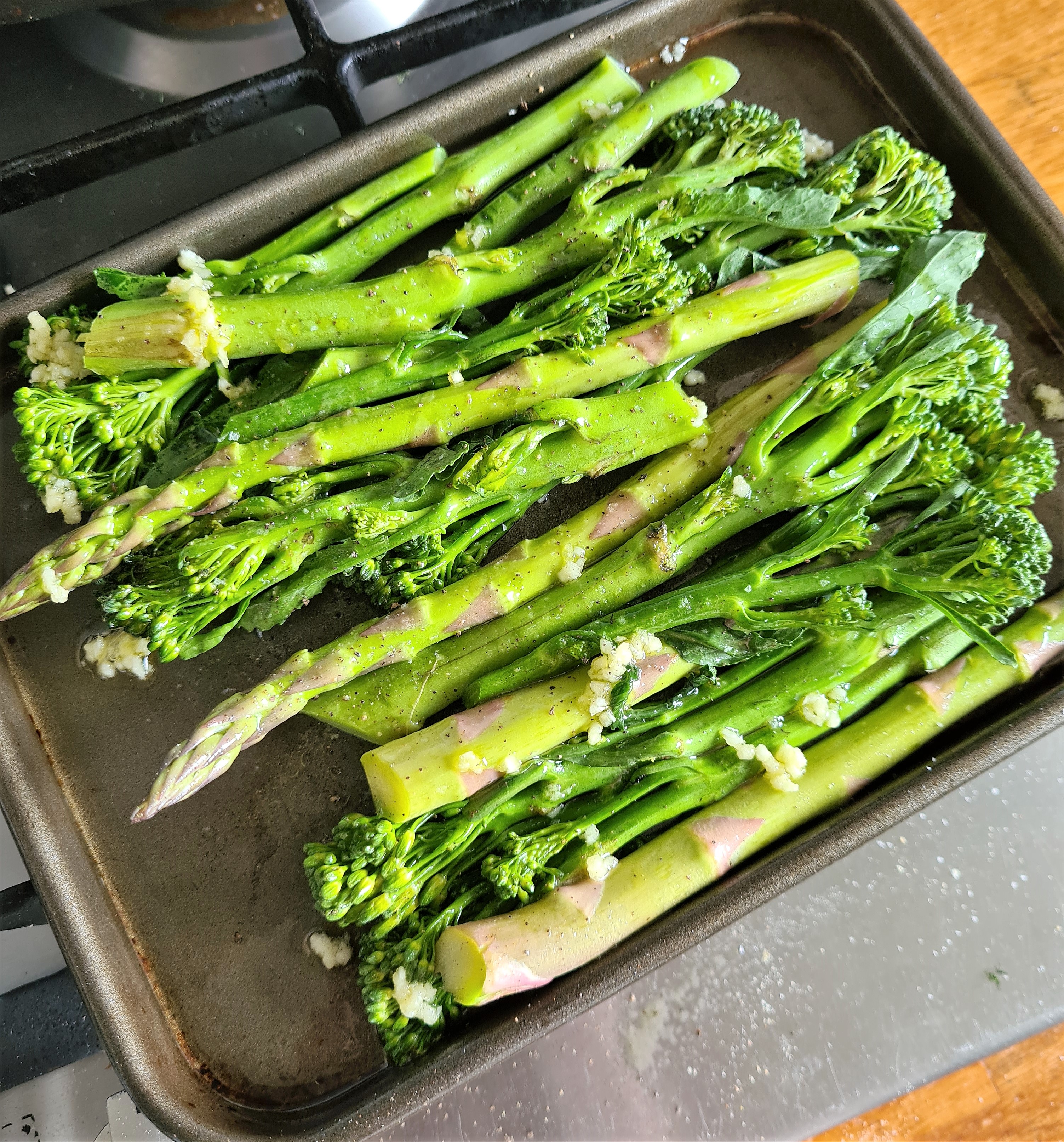 When the oven is at temp, take the tray out and lay the tenderstem and asparagus out and season with salt and pepper.