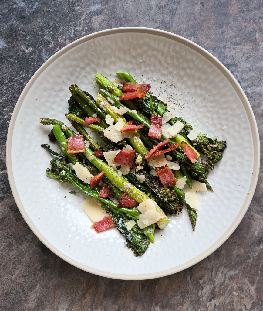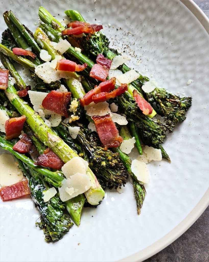 I also love that my son will eat this, not in salad form as he still doesn’t favour things mixed together but he will eat the roasted tenderstem and might even eat the asparagus (if they are aren’t overcooked) and of course he just loves the bacon.