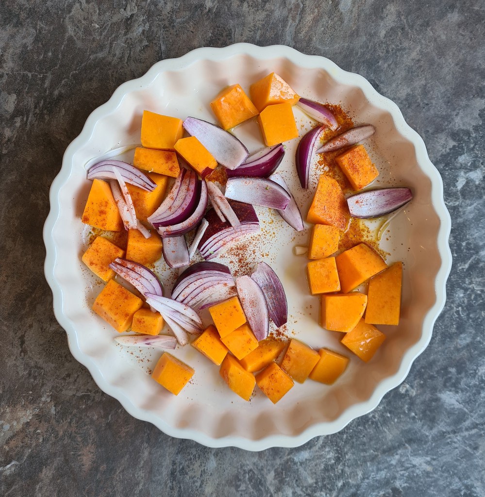 Chop your butternut squash and onion, once the oven has come to temperature, take the tray out, add the oil and add the butternut and onion. Sprinkle with the paprika and pop into the oven for 25 minutes.